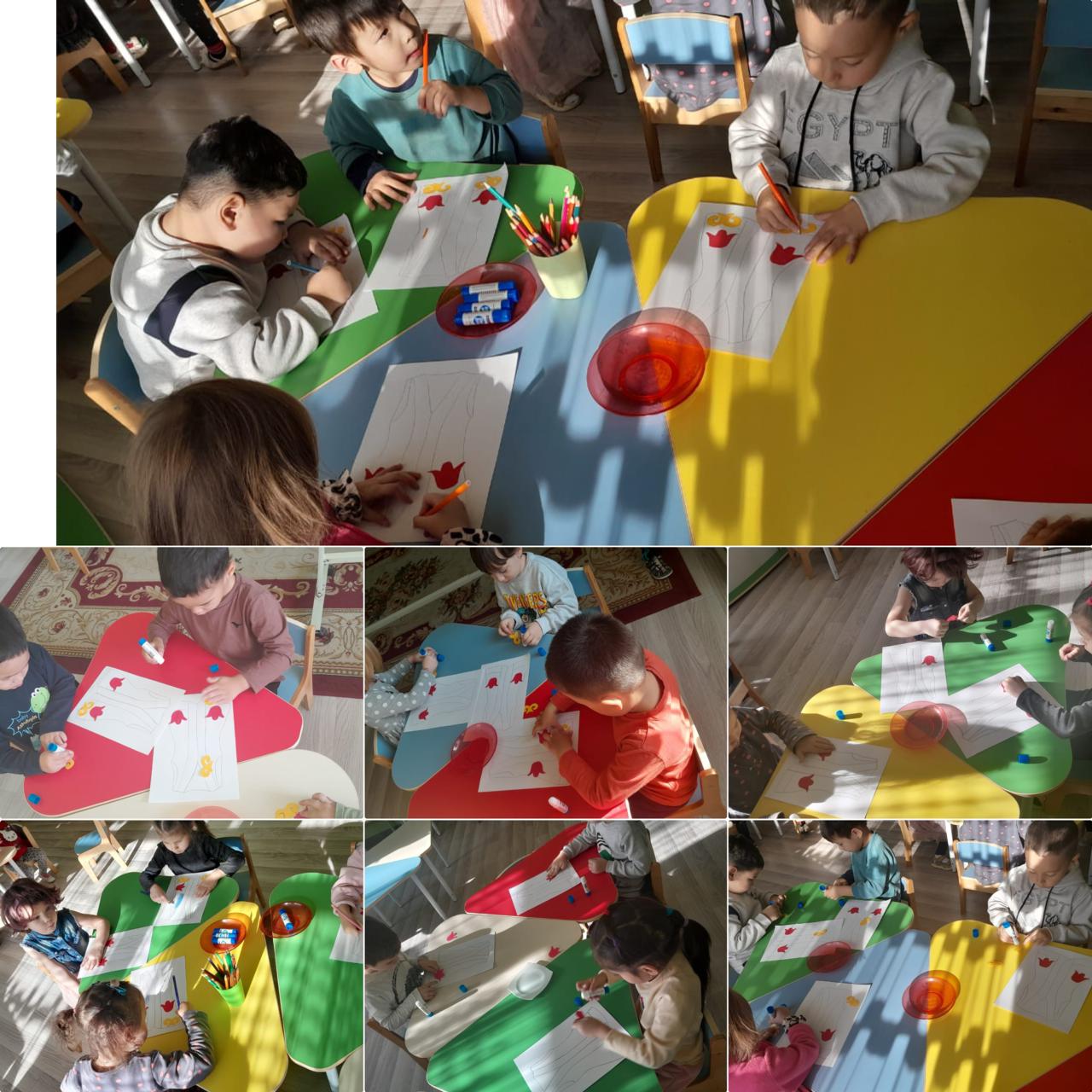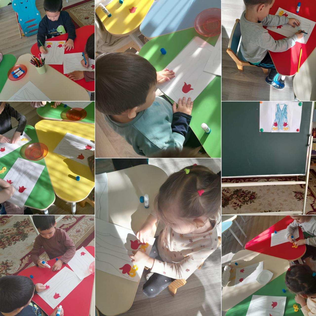 Мақсаты/Цель: Самостоятельно располагать и наклеивать элементы орнамента. Развивать у детей творческие способности, чувство цвета, композиции. Воспитывать интерес к казахскому народному творчеству. Развивать двигательную активность.